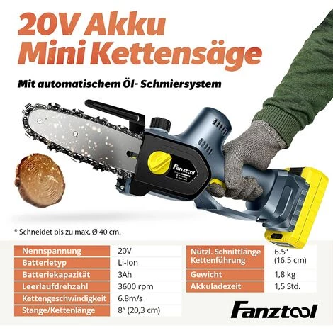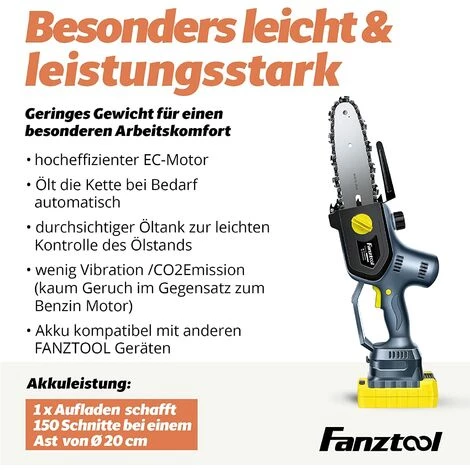 Durch den besonders effizienten und bürstenlosen EC-Motor der Handsäge ist das Gerät einfach in der Handhabung und besonders langlebig. Da kein Benzin benötigt wird zum Antrieb, erzeugt die Säge im Betrieb nur wenig Vibrationen und CO2 Emissionen und bietet somit höchsten Arbeitskomfort. Ein weiterer Vorteil des elektrischen Motors ist, dass der Akkutausch im Handumdrehen erledigt ist und Sie schnell weiterarbeiten können.AutoschmierungIn den kleinen integrierten Tank der Handsäge passen ca. 80ml Öl. Die automatische Schmierung sorgt dabei dafür, dass die Kette ruhig und nicht zu heiß läuft und trägt somit zur Langlebigkeit des Geräts bei.SperrknopfDer Sperrknopf sorgt für zusätzliche Sicherheit, da sich die Säge nur starten lässt, wenn dieser zuvor gedrückt wurde. So wird vermieden, dass das Gerät unbeabsichtigt gestartet wird.KettenspannschraubeMit der Spannschraube können Sie die Kette stets spannen oder nachspannen. So wird verhindert, dass die Kette der Säge zu viel Spiel hat und dadurch Schäden am Gerät entstehen.ÖlstandDamit die Säge immer ausreichend geschmiert wird, kann der Ölstand durch ein kleines Fenster einfach geprüft und bei Bedarf schnell nachgefüllt werden.