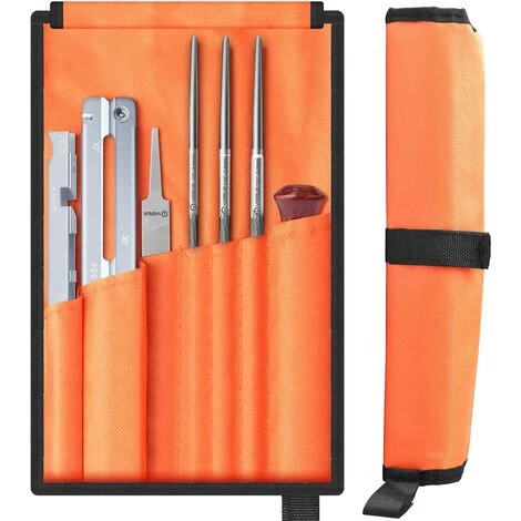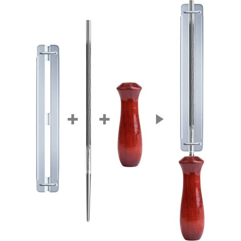 - ✔Paket: 3 Rundfeilen – 5/32 (4 mm), 3/16 (4,8 mm), 7/32 (5,5 mm) – Feilenführungshalter (Klemme) – Flachfeile – Schnellprüflehre – Holzgriff und Tasche.