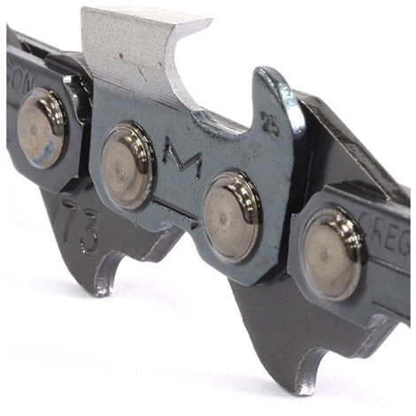Kette mit leicht abgerundeten Schneidezähnen und schmalem Schnitt. Verstärkte Chromschicht auf den Schneidezähnen für deutlich höhere Standzeiten der Sägekette.
