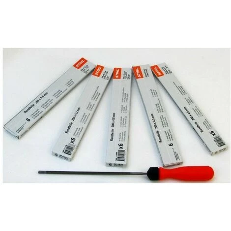 ProduktbeschreibungSTIHL Rundfeile 6 Stück mit Feilenhalter für SägekettenProdukteigenschaften STIHL Rundfeile 6 Stück mit Feilenhalter von Stihl für Sägeketten Lieferumfang: STIHL Rundfeile 6 Stück für Sägeketten 4,5 mm für 325 (5605 771 4506), mit 1 Kunststoff Feilenhalter,