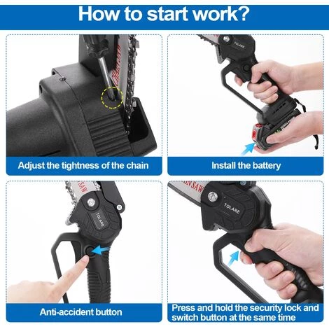 【HOCHEFFIZIENTE HAND KETTENSÄGE 】 Die Tolare mini akku kettensäge verwendet eine führungskette mit extra hoher härte, die ein reibungsloses schneiden gewährleistet. Die schnittgeschwindigkeit kann per schalter je nach intensität und betriebsbedingungen angepasst werden, und stiehlt mini kettensäge zum besseren hand kettensägehutz der bäume. Ziehen sie zur sicherheit den akku der mini chainsaw heraus, wenn sie nicht verwendet wird.